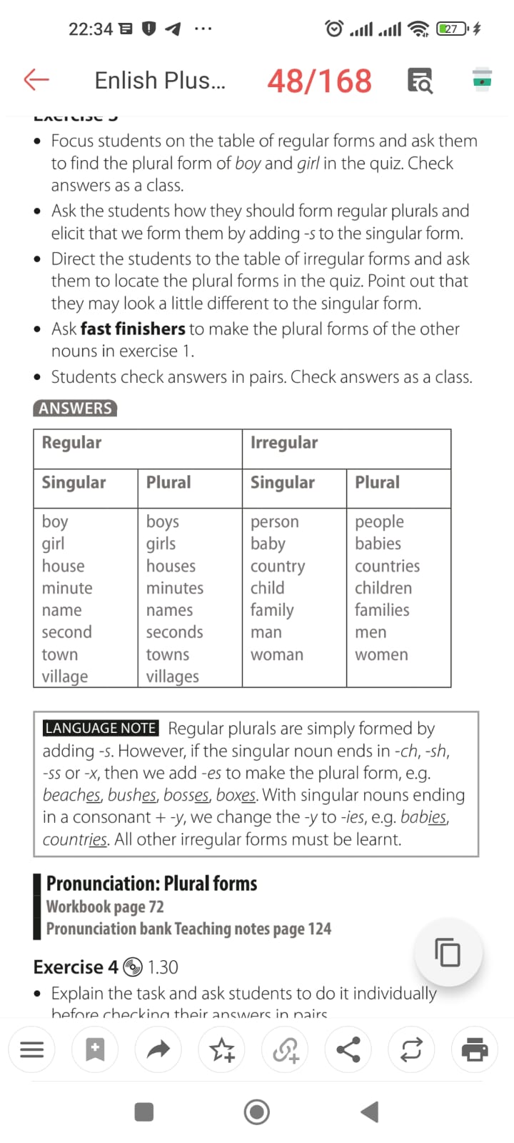 Ex: 1 P:38 • Read through the instructions together and make sure students understand what they have to do. In a weaker class, revise the rules for forming plural nouns. • Check answers as a class. Ex: 2 P:38 • Focus on the table and on the words in the left-hand column. Read through them with the class, checking for understanding. • Students do the task in pairs. Encourage students to match the words they recognize first Ex: 3 P:38 • Tell students to work in pairs to choose the correct words. Check answers as a class. • Students complete the rest of the task individually, though you could ask students to do it in pairs in a weaker class. Check answers as a class. Conclusion during the lesson some tasks differentiated by outcomes of the students and by their abilities. |