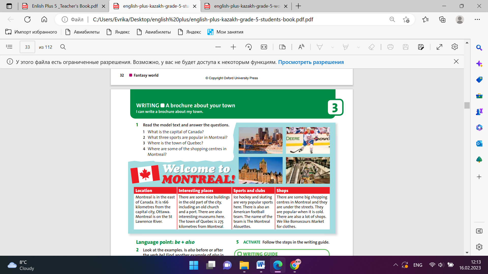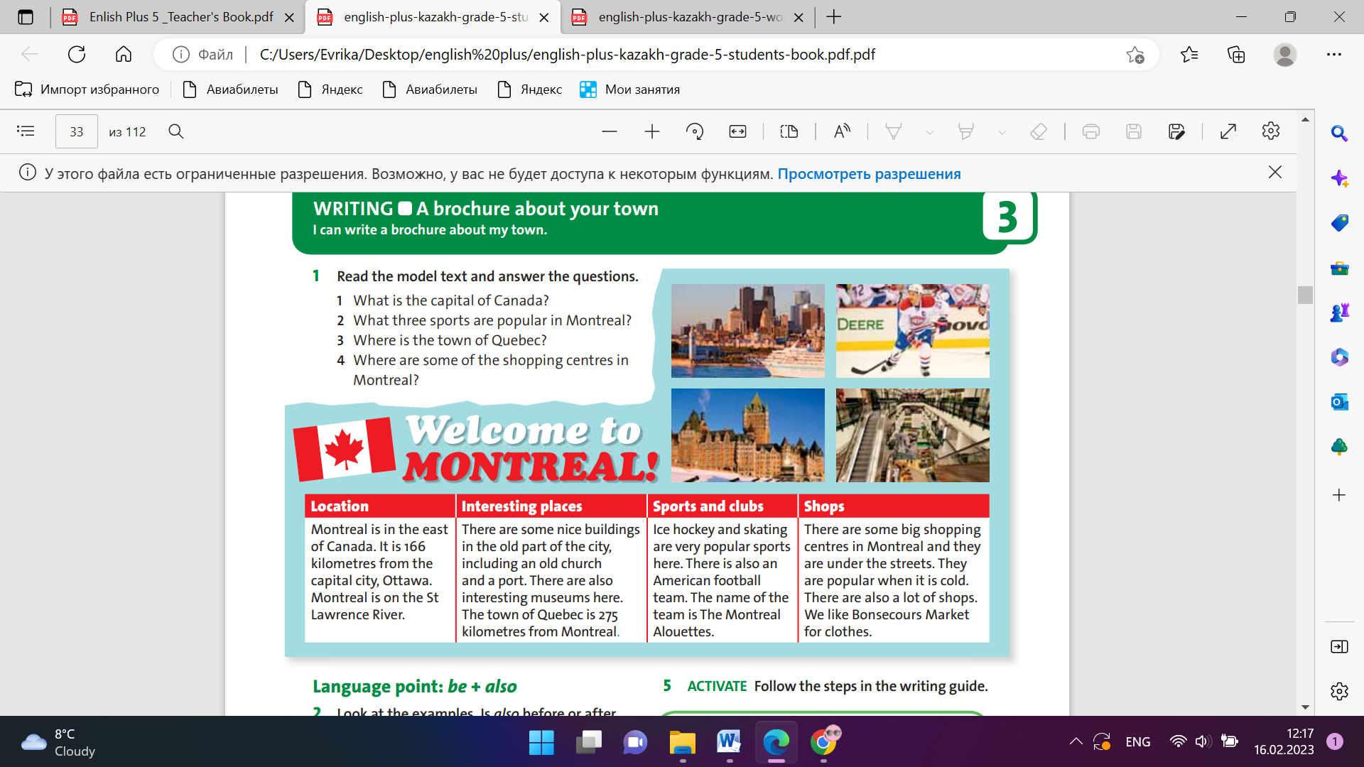 Students read the model text and answer the questions. ANSWERS: 1 The capital of Canada is Ottawa. 2 Ice hockey, skating and American football are popular sports in Canada. 3 Quebec is 275