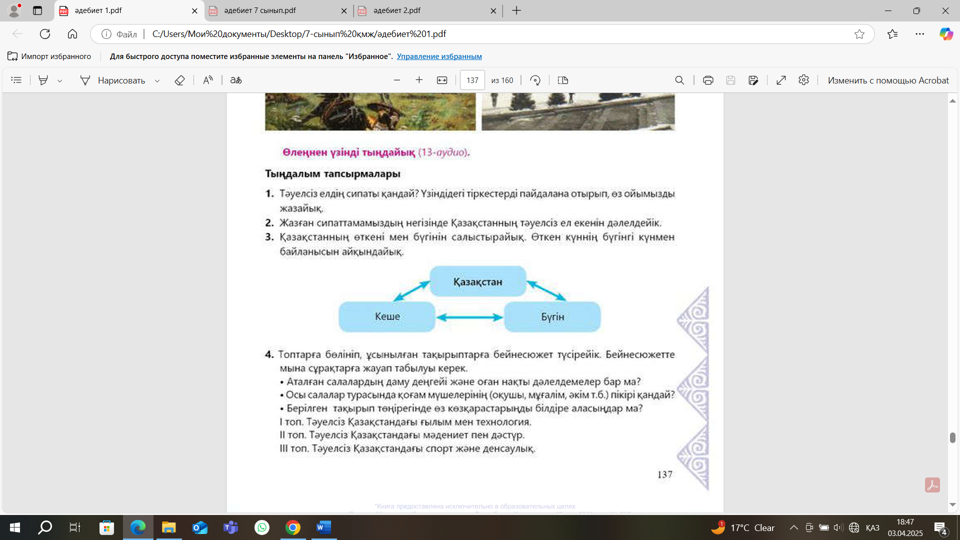 Бағалау критерийімен, тапсырманы орындау қадамдарымен таныстыру. ЖЖ. 2-тапсырма. Қазақстанның өткені мен бүгінгі салыстырыңыздар.Өткен күннің бүгінгі күнмен байланысын анықтаңыздар.