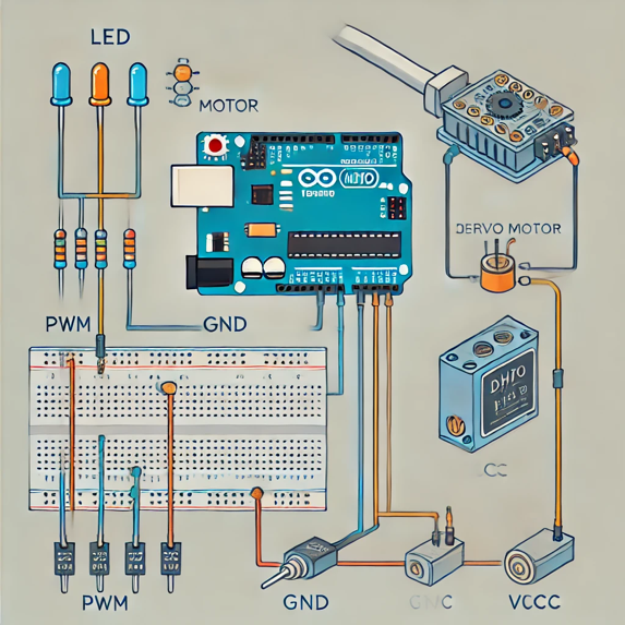 Қозғалтқышты басқару (PWM арқылы) • Servo немесе DC моторды Arduino арқылы басқару • PWM (Импульстік ені модуляциясы) негіздері • Жұмысты тексеру |