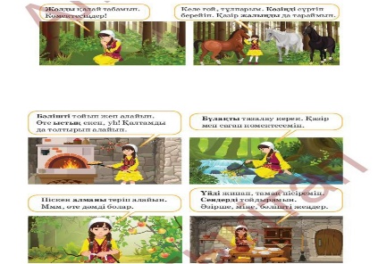 Жаңа сөздерді сөздікке көшіріп жазады. Берілген сөздерге қарама-қарсы мәндес сөздерді тауып жазады. Сурет- сызба арқылы берілген мәтінді оқып, мазмұндайды Сөйлемдерді мағына сай орналастырады. Тәуелдік жалғауын жалғайды. Жіктік жалғауын жалғайды.