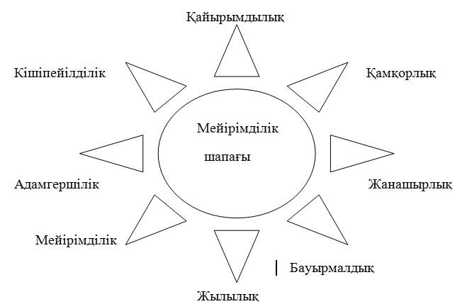 Ой шақыру: Балалар, осы көрініс арқылы жан-дүниемізде қандай өзгерістерді сезіндік? Бұл сиқырлы әлемнен біз қандай нұрды алып келдік? Мейірімділік деген сөздерді қалай түсінесіңдер? «Қайырымдылық», «жанашырлық» деген сөздерді қалай түсінесіңдер? Мұғалім сөзі: Қайырымдылық - мейірімділіктің іс жүзіндегі бір көрінісі. Қайырымдылық - мүдделі, кіріптар, көмекке құштар адамдарға іс жүзінде жақсылық жасау. Қазіргі заманда байыған адамдар «қайырымдылық қауымдастығын» ұйымдастырып, сол арқылы жеке адамдарға, әрі асса, бүкіл елге қайырымдылық жасайды. Халқымыз көмекке мұқтаж адамға көмек көрсетіп, қайырымдық жасау,кіріптарға қайыр беру, қарттарды аялау, мүгедектерді қорғап қоршау әрбір қайырымды адамның адамгершілік борышы деп есептейді. Қайырымдылық жылу беру, сыйлық ұсыну, демеуші болу, сый-сыбаға тарту, көрімдік, байғазы бәсіре т.б жөн –жоралғылар арқылы іс жүзінде ізеттілікпен, ілтипаттылықпен, инабаттылықпен, сыпайылықпен орындалады. Қайырымды, мейірімді адам- айналасындағыларға және бүкіл адамзатқа тек жақсылық ойлап, оларға мейір-шапағатын төгіп, жанашырлық, қамқорлық, қайырымдылық жасауға әзір тұрады, әркімге әдеппен, ізетпен, инабатпен қарайды. « Мейірімділік нұры» жаттығуы. Қазір мен тақтаға мейірімділік шапағын ілемін.Бұл шапақтан жан-жаққа шуақ шашылуы керек. Ол үшін алдарыңдағы стикерге мейірімділікке байланысты сөздер жазып, шуаққа нұр таратамыз, яғни мейірімділік нұрын шашамыз. |