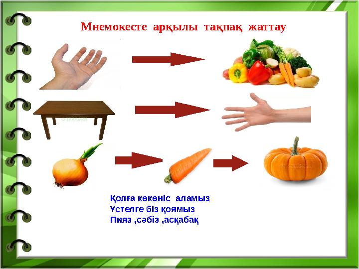 Мнемокестені тақпақтарды жаттату кезінде өте тиімді. Жұпты суреттер арқылы бала көрсете отырып, тақпақты жаттайды. Баланы қызығушылығы артады, сабақты ойынға айналдырады.