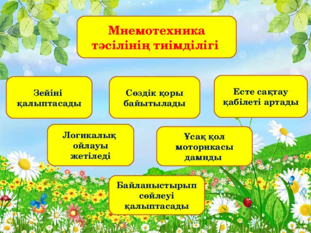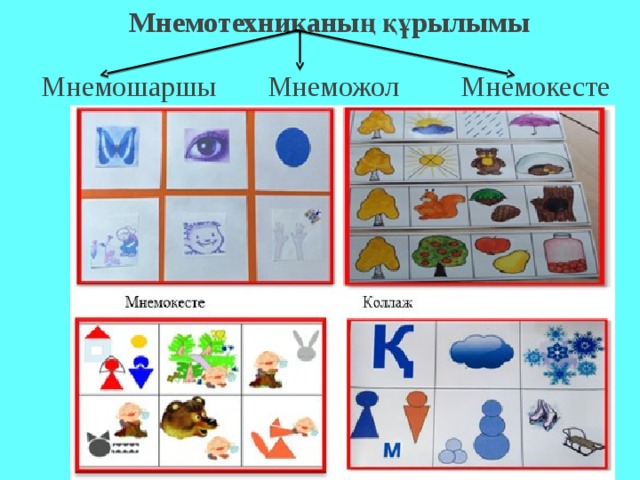 Мнемотехника дегеніміз не? Ол балалардың қоршаған орта туралы алған білімдерін тиімді есте сақтауы, хабарламаны сақтап және жаңғыртуы, тіл дамуын қамтамасыз ететін әдіс-тәсілдер жүйесі.