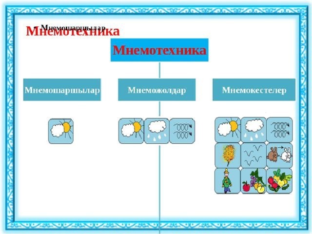 Мнемотехника - оңай жолдың қиынына қарай құрылады. Мнемокесте қарапайымнан басталып, күрделене түседі.