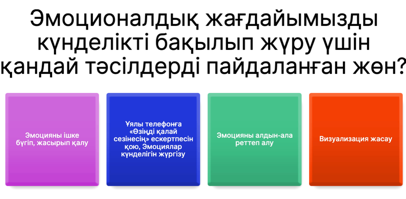 Эмоциялық жағдайларды талдайды. Эмоцияларды басқару тәсілдерін сипаттайды. Релаксация әдістерін орындайды. Онлайн платформада эмоция күнделігін жүргізеді. |