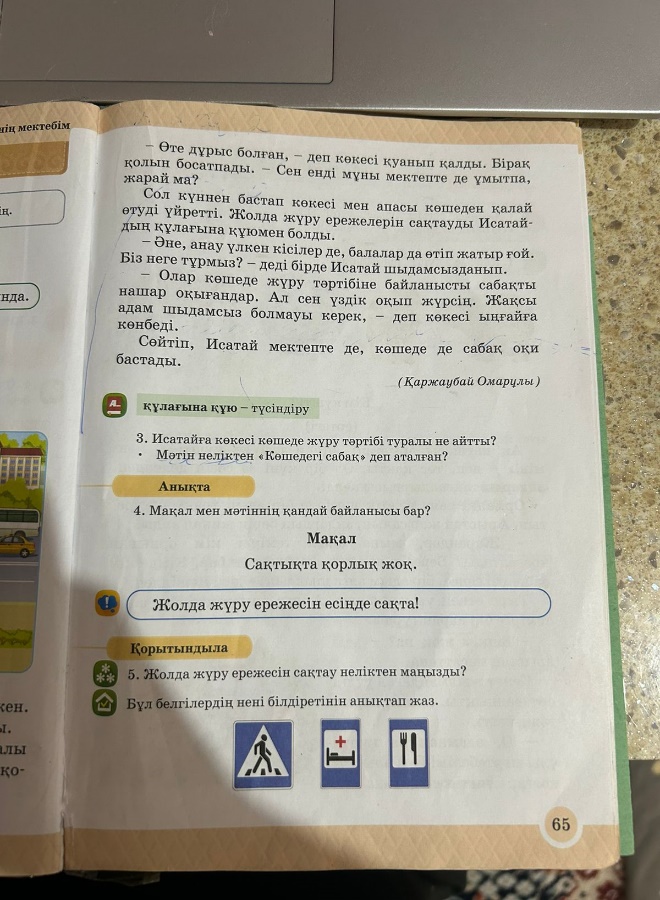 Сабаққа дайындық жасап, жақсы тілектер тілейді. Үй тапсырмасын пысықтайды Көлік түрлерін табу Мәтіннің мазмұнын талдайды Жеке жұмыс жасайды Мазмұнына қарай қимылдарды қайталайды Жаттығу жасайды Тапсырманы орындайды Мақалды түсіндіреді Үй тапсырмасын алады |