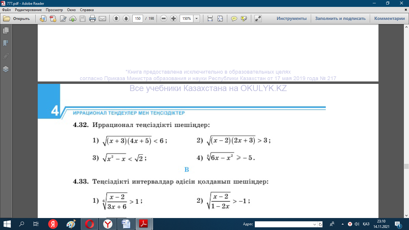 11.2.2.2 – теңдеудің екі жағын бірдей n-ші дәрежеге шығару әдісі арқылы иррационал теңдеулерді шеше алу; 11.2.2.3 – айнымалыны алмастыру әдісі арқылы иррационал теңдеулерді шеше алу; 11.2.2.5 – иррационал теңсіздіктерді шеше алу; |