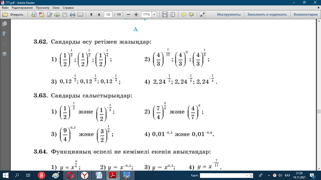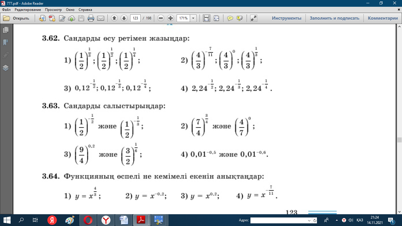 11.3.1.10 – нақты көрсеткішті дәрежелік функция анықтамасын білу, дәреже көрсеткішіне тәуелді дәрежелік функция графигін салу; 11.3.1.11 – дәрежелік функция қасиеттерін білу. |