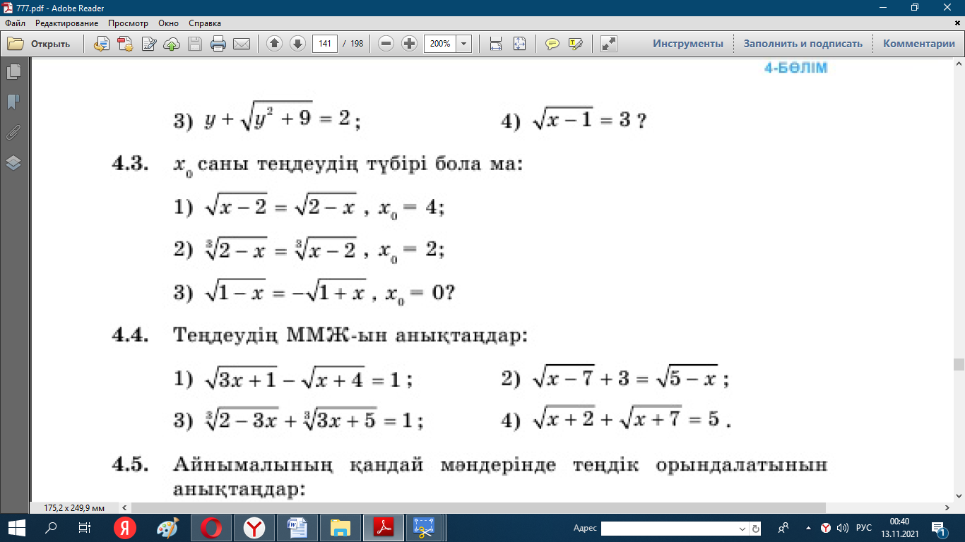 11.2.2.3 – айнымалыны алмастыру әдісі арқылы иррационал теңдеулерді шеше алу; 11.2.2.4 - иррационал теңдеулер жүйелерін шеше алу; |