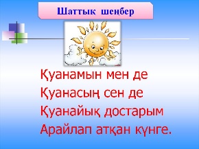 Білім алушылар мұғаліммен сәлемдеседі, бірге шеңбер құрып, өлең шумақтарын қайталайды Оқушылар мұғалімнің түсіндіргенін мұхият тыңдайды. Қойылған сұрақтарға ойланып, жауап береді. Оқушылар Жарақат түрлерін,көмек түрлерін атап түсіндіреді. Оқушылар Күдікті затты тауып алған жағдайда не істеу керектігі жөнінде әңгімелейді. Өзі көрген, куә болған нәрселер туралы пікір білдіреді. |