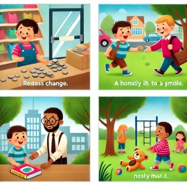 1. Ұйымдастыру кезеңі (5 минут) Сәлемдесу. Оқушылардың көңіл-күйін сұрау. Оқушыларды шеңберге тұрғызып, бір-біріне жылы сөздер айту. Мысалы: «Мен саған сенемін, сен адалсың!», «Сен шыншыл адамсың!» «Әнұран» орындау Тақырып ашу. Бүгін не туралы әңгімелесетінімізді анықтап алайық. Адалдық туралы қысқаша әңгімелеу. «Адалдық деген – шындықты айту, өтірік айтпау, өз ісіңе жауап беру. Егер біз адал болсақ, адамдар бізге сенеді.» Қызықты сұрақтар: - Өмірде адалдық қажет пе? - Сендер қандай жағдайда адал болдыңдар? 1-тапсырма: Адалдық әңгімесі "Жоғалған әмиян" Мұғалім оқушыларға мына әңгімені айтып береді: Бір күні Айша мектептен келе жатып жолда бір әмиян тауып алады. Әмиян ішінде көп ақша бар екенін көреді. Бірақ ол бірден ойға түседі: "Бұл әмиян біреудің меншігі ғой. Мен оны иесіне қайтаруым керек." Әмиянның ішінде иесінің телефон нөмірі жазылған қағаз бар екен. Айша дереу сол нөмірге қоңырау шалады. Әмиян иесі қуанып, алғыс білдіреді. Ол Айшаның адал әрекетін жоғары бағалап, оған кішкентай сыйлық жасайды. 2-тапсырма: «Суретпен жұмыс» Оқушыларға адалдыққа байланысты суреттер беріледі. Олар қандай жағдай көрсетілгенін түсіндіреді. 3-тапсырма: «Адалдықты көрсет» (рөлдік ойын) Оқушыларға жағдаят беріледі: «Досыңның қаламы сынып қалды, сен оған көмектескің келді. Не істейсің?» Қауіпсіздік сабағы: БІРІКТІРУГЕ БОЛМАЙТЫН ӨНІМДЕРДІҢ КОМБИНАЦИЯСЫ Сұрақтар қою: Егер қатты қыздырылған табаға май құйсаңыз, оның жанып кетуі мүмкін екенін білдіңіздер бе? Бұл өртке әкеледі. Сіз тамақтың дайын болғанын тексергіңіз келсе, сізге не болуы мүмкін екенін білесіз бе? Мысалы, пештегі торт, қазандағы ыстық сорпа немесе қайнап тұрған шәйнек. - Сіз балалар үшін қауіпті және ешбір жағдайда оларға қол тигізбейтін тағамдарды білесіз бе? Ас үйдегі шкафтарда сақталатын ыдыс-аяқ, өткір заттың барлығы балаға қауіп төндіреді. Ең қауіптісі сірке қышқылы немесе оны «уксус» деп атайды. Бірақ басқа да тұздықтар, сироптар мен пасталардың дәмін татып қарауға болмайды. Тіпті ең қарапайым және біз білетін тағамдар да қауіпті болуы мүмкін, себебі оларды қалай дұрыс тұтыну керектігін білмесеңіз және оларды бір-бірімен біріктіруге болатынын не болмайтынын білмесеңіз, үлкен қиындыққа әкелуі мүмкін. Бейнежазбаны тамашалау. Тәжірибе жасау: 1) «Кока-Кола» бөтелкесін ашу; 2) оған «Ментос» тәттісін салу; - Ой, не болды? - Иә, кейбір өнімдермен «Кока-Коламен» үйлеспейді және кішкентай жарылыс сияқты химиялық реакцияға түседі. Осы жарылыс сіздің асқазаныңызда болуы мүмкін деп елестетіп көріңіз! - Иә, «Кока-Кола» біздің ағзамызға зиян тигізуі мүмкін. - «Кока-Коламен» пайдалы өнімді қолдансаңыз не болатынын көрейік. Пайдалы өнім ретінде біз сүтті аламыз. Сұрақ: сіз қалай ойлайсыз сүт пайдалы өнім бе? Қараңызшы, не болып жатыр? Стаканда бұлтты, қалың тұнба пайда болды, қабыршақтар пайда болды. Сұрақ: Неге бұлай болғанын білесіз бе? «Кока-Кола» сүтпен араласқанда реакцияға түсіп, ашып кетеді және мұндай жағымсыз тұнба пайда болады. Мұндай сүтті ішуге болмайды. «Артығын табу» ойыны Тақтада зиянды және пайдалы өнімдердің суреттері берілген. Біз барлық зиянды өнімді тауып, оларды алып тастауымыз керек. Жарайсыздар, балалар, керемет білімдеріңізді көрсетіп, барлық зиянды өнімді таптыңыздар. Қорытынды Сабақтың негізгі идеясын қайталау: «Адал адамды бәрі жақсы көреді, сенім артады. Адалдық – ад