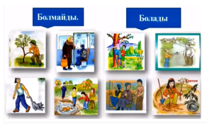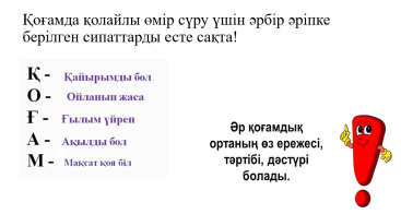 -Сәлеметсіңдер ме, оқушылар! Дүниетану пәні. Психологиялық сәт. Жабырқауды білмейміз, Жалқаулықты сүймейміз! Біз талапты жасұлан, Үлгі аламыз жақсыдан. (Барлық оқушы, бас бармағын көрсетеді.) Оқушыларға бөлім бойынша «Демалыс мәдениеті. Мейрамдар» туралы сұрақтар қойылады. -Оқушылар мамыр айында қандай мерекелер бар? Дескриптор: Оқушылар мамыр айындағы мерекелерді атайды. Отбасы күні туралы айтады. Оқушыларды топқа бөлу. Қызыл бантик, галстук таққан оқушыларды түстеріне қарай екі топқа бөлу. «Қызыл» топ, «Көкшіл»топ Оқулықтағы иллюстрациямен жұмыс жасаймыз. -Бүгінгі сабақтың тақырыбын білу үшін, Ненің артық екенін анықта. Не себепті? Табайық -Мен сөзіне артық сөзді анықтаңыздар. -Дұрыс айтасыздар! Адам сөзі артық. Бүгінгі жаңа тақырып Мен және қоғам. Дескриптор: «Мен және қоғам» тақырыбын анықтайды және сол бойынша қорытындылар шығарады; Жаңа сабақтың мәтінімен таныстыру. -Адам дуниеге келгеннен бастап белгілі бір қоғамда өмір сүреді. Адам үшін отбасы, мектептегі сыныбы, колледждегі тобы, жұмыстағы ұжымы, достары мен құрбыларының маңызды орны бар. Әр адамды көпшілік ортада өзін қалай ұстауы керек деген мәселе әрқашан толғандырады Дескриптор: Мәтінді оқиды. «Пікірлер сызығы» Өз ойларын айтып беру - Балалардың қайсысының пікірі дұрыс? Неліктен? Әли: Мектеп ішіндегі сынып, асхана, спортзал қай жерде орналасқанын білу жеткілікті Мерей: Мектепте, көшеде, қоғамдық орындарда өзіңді дұрыс ұстай білу маңызды -Әрине балалар, жарайсыңдар! Мерейдің жауабы дұрыс екен. Дескриптор: Қоғамдық орындарда ережелерді дұрыс қолданудың ережелерін құрастырады. Ережелерді есіңе сақта! Адам белгілі бір ортада қандай да бір жағдайға байланысты өзін ұстау ережелеріне сүйенуі керек. Қоғамдық орындарда қандай әрекеттерді істеуге болады және нені істеуге болмайды? - Жарайсыңдар! Дұрыс ойладыңдар. Ағаштарды сындыруға болмайды, Жануарларға қиянат жасауға болмайды. Құстарға қамқор жасауға болады. Ағаш отырғызып, табиғатты қорғауға болады. Құрылған ережені есте сақтау керек. Сергіту сәті. «Қоғамдық жерге саяхат» «Қызыл» топ: «Қоғамдық көлікте» өзіңді ұстау ережесін құру. «Қызыл» топ: «Мектепте» қоғамдық орында өзіңді ұстай білу туралы ереже жазады. Дескриптор: Тәртіпті ережелердің қолданудың ережелерін құрастырады. «Сипатта» тәсілі - Қоғамда Қ қайрымды бол О ойланып жаса Ғ ғылым ізде А адал бол М мақсат қоя біл