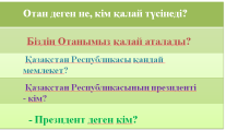 Патриот – ұлтын сүйетін, өз тарихын, туған тілін құрметтейтін, ұрпақтан ұрпаққа жалғасқан салт – дәстүрін дәріптейтін, ұлттық қадір – қасиетімізді арттыруға үлес қосатын саналы тұлға. Туған елі үшін үнемі тер төге қызмет етіп, халқымыздың мол рухани құндылықтарын бағалай білетін асыл тұлға. - Отан – әр адамның жүрегіне жылы тиер қасиетті сөз. Отан – сенің туған елің, туған жерің, дос–жарандарың, туған-туысқаның. Отан - бұл өзіңнің тұратын, өмір сүретін, қызмет ететін жерің. Отан адам үшін біреу ғана. Отанды анаға теңейді. Себебі, Отан сендерді анаңдай қорғайды, көмектеседі, күш береді. Біз Отанымызды, елімізді сүйеміз. Біз, Қазақстанның патриотымыз! Отан деген не, кім қалай түсінеді? Отан дейміз кең-байтақ астананы, Жасыл жайлау, жаңа жол, жас қаланы. Отанның шеті де жоқ, шегі де жоқ, Ол бірақ өз үйіңнен басталады. - Біздің Отанымыз қалай аталады? - Қазақстан Республикасы қандай мемлекет? - Қазақстан Республикасының президенті кім? - Президент деген кім? Біздің еліміздің президенті Қасым Жомарт Тоқаев. Ал біздің Отанымыз – Қазақстан Республикасы. Сан ғасырлар бойы ата-бабаларымыз жерін жаудан қорғап, бүгінгі ұрпақ, бізге жеткізді. Қазақстан жер көлемі бойынша 9 орында тұр. Қазақстанда үлкен қалалар көп. Олар: Алматы, Астана, Қарағанды, Шымкент, Көкшетау, Қостанай, Ақтау, Павлодар, Ақтөбе, Тараз, Қызылорда, Өскемен, Семей, Талдықорған. Бұлар – әдемі қалалар. Аталған қалаларда қазақтар, орыстар, ұйғырлар, өзбектер, корейлер, украйндер және тағы басқа ұлттардың өкілдері тұрады. Олар тату-тәтті, бірлікте өмір сүріп жатыр.