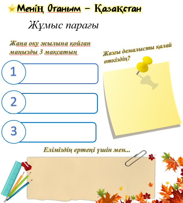 Оқушыларды жаңа оқу жылына ынтыландыру және позитивті көңіл-күй қалыптастыру. Биік шыңдарға біліммен, еңбекпен шығуға баулу. Танымдық белсенділікті арттырып, өз пікірлеріңді тұжырымдап айтуға, еркін сөйлеуге, өзіне сенімді болуға үйрену. Отан туралы білімдерін бекіту. |