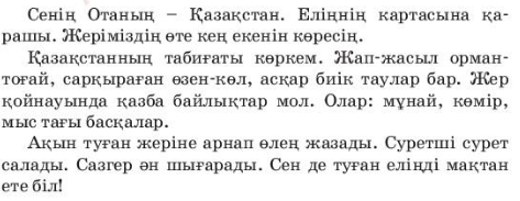 ҚБ 2-тапсырмасы Жеке жұмыс «Түсініп оқу» әдісі ЖИ ОДД:білу,түсіну,қолдану Оқылым «Менің Отаным» мәтіні Нұсқау: «Менің Отаным» мәтінін тізбектеп, түсініп оқиды. Мұғалім оқушыларға мәтінді алдымен іштей оқып,белгілеп оқиды