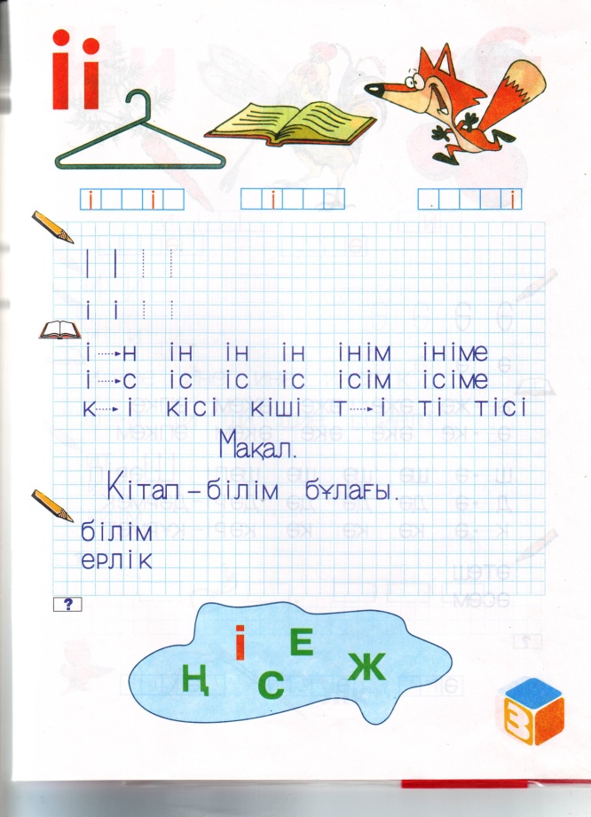 Ойлау дағдылары: білу және түсіну, қолдану Жетістік критерийлері: білім алушы і әрпін ің орнын табады, жазады. Дауысты, дауыссыз дыбыстарды сәйкес түспен белгілейді. |