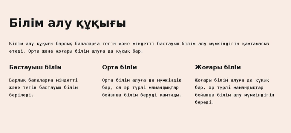 Білім алу құқығы барлық балаларға тегін және міндетті бастауыш білім алу мүмкіндігін қамтамасыз етеді. Орта және жоғары білім алуға да құқығы бар.