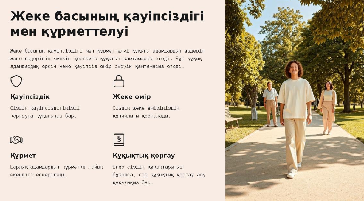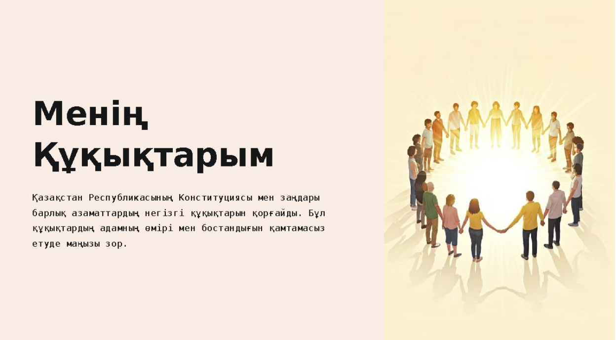Қазақстан Республикасының Конституциясы мен заңдары барлық азаматтардың негізгі құқықтарын қорғайды. Бұл құқықтардың адамның өмірі мен бостандығын қамтамасыз етуде маңызы зор. Балалар сендердің қандай құқығыңыз бар?