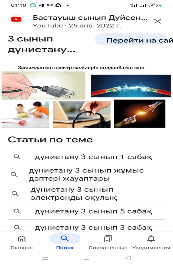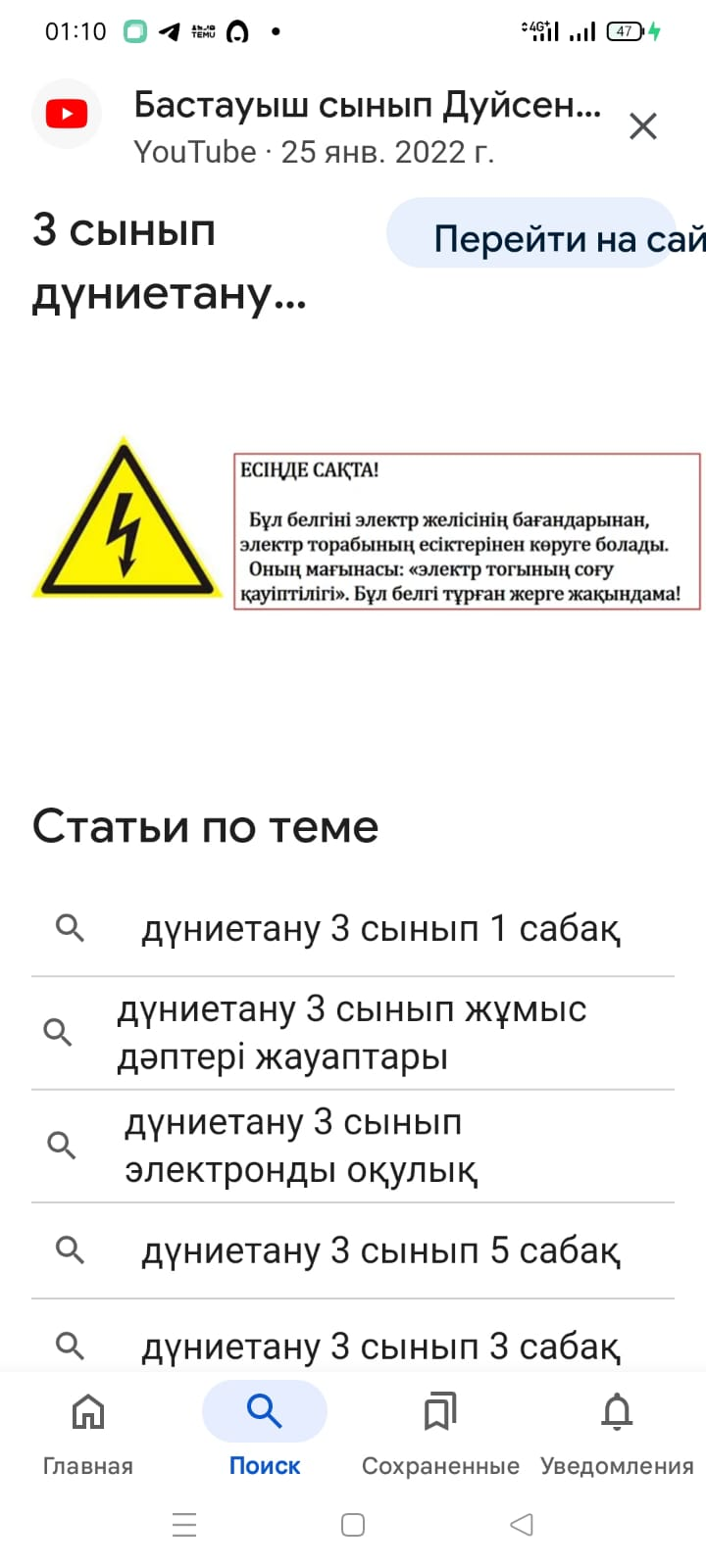 Олар қандай қызмет атқарады? Бұл заттарға ортақ қандай қасиет бар? Бүгінде адамзат тіршілігін электр қуатынсыз елестету қиын. Электр қуаты үйлерді, көшелерді жарықтандырады, үй ішінің жайлылығын қалыптастырады. Азықтүлікті сақтауда, тағам әзірлеуде, үйдің ішін тазалауда, теледидарды, компьютерді іске қосуда, кір жуу, кептіру, үтіктеуде қолданылады. 2-тапсырма Есіңде сақта! Бұл белгіні электр желісінің бағандарынан, электр торабының есіктерінен көруге болады. Оның мағынасы: «электр тогының соғу қауіптілігі». Бұл белгі тұрған жерге жақындама!