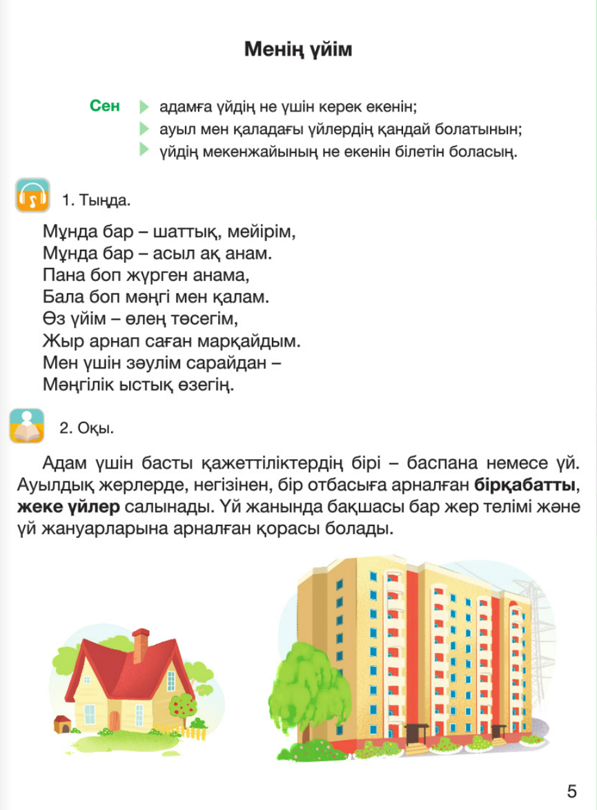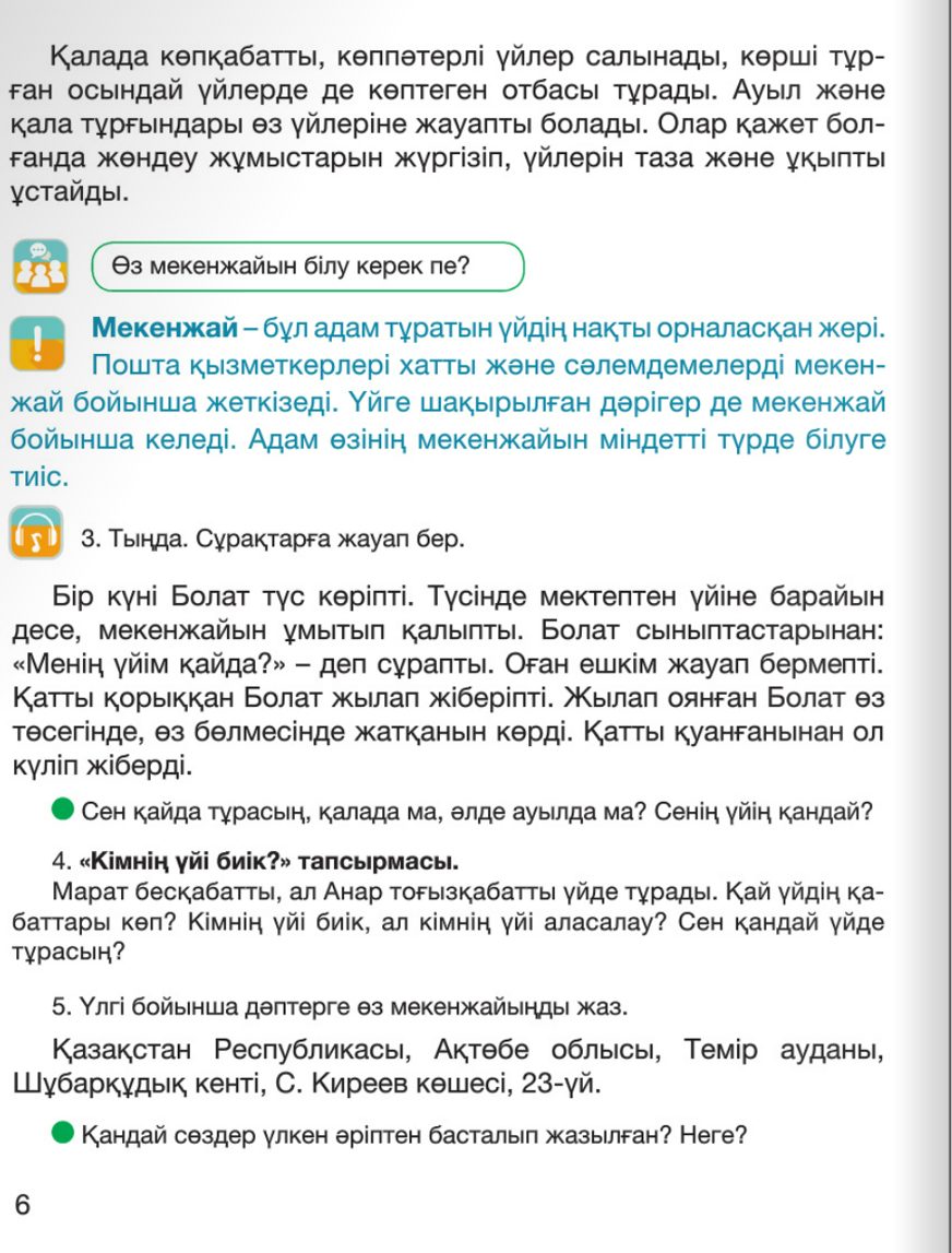 -Көңіл-күйің қалай? -Сабаққа деген көңіл-күйің жақсы болса, онда сабағымызды бастаймыз! -Біз бүгін «Менің үйім. Мекенжайым» деген тақырыпта әңгімелейтін боламыз. 1-тапсырма «Тыңда, оқы, үйрен!» тапсырмасы Оқулықпен жұмыс