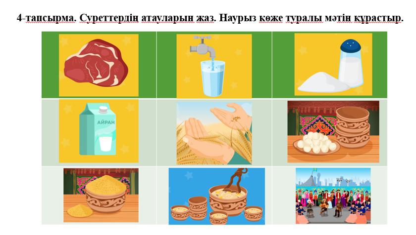 Жаңа сөздермен жұмыс. 1-тапсырма. «LearnindApps.org» бағдарламасындағы сканвордтан бүгінгі сабақтағы жаңа сөздерді табыңыздар. ОҚЫЛЫМ. Қазақстанда мереке көп. Біз мерекеде бір-бірімізге сыйлық береміз. Құттықтау хат жазамыз. Жақсы тілек айтамыз. «Мереке құтты болсын!» — деп құттықтаймыз. Мерекелік дастарқан жасаймыз. Ет асамыз. Бауырсақ пісіреміз. Ең үлкен мереке — Наурыз. Наурызда наурызкөже пісіреді. АЙТЫЛЫМ. 2-тапсырма. Сұрақтарға жауап береді. 1. Мерекеде бір-бірімізге не береміз? 2. Бір-бірімізді қалай құттықтаймыз? 3. Дастарқанға не қоямыз? 4. Наурызда не пісіреді? Сергіту сәті. «Атомдар және молекулалар» ойыны. 4-тапсырма. Суреттердің атауларын жаз. Наурыз көже туралы мəтін құрастыр.