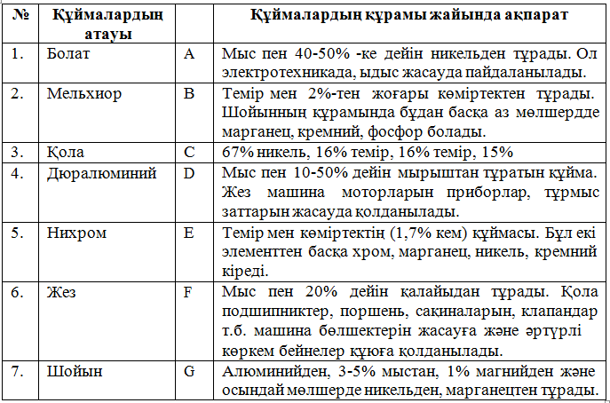 Топта талқыланған тақырыпты пысықтау мақсатында жеке, жұптық тапсырмалар ұйымдастырылады. Жеке жұмыс ерекше білімді қажет ететін оқушыларға қолдау көрсету үшін сәйкестендіру тапсырмасы беріледі. Ғылымда, техникада және тұрмыста қолданылатын маңызды құймалардың шойын, болат, жез, қола, мельхиор, дюралюминий құрамын атап, салыстыру мақсатында сәйкестендіру тапсырмасы ұйымдастырылады. |