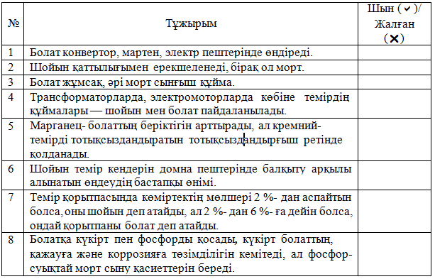Сабақты бекіту тапсырмалары. Шойын және болатты алу әдістерін және қасиеттерін сипаттау мақсатында «Шындық, жалған» әдісі қолданылады. |