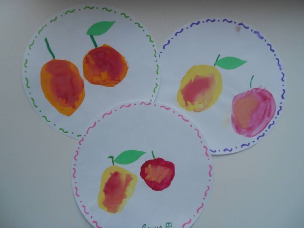 Цели: - учить детей рисовать яблоки используя два цвета краски