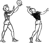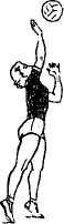 Передача мяча сверху двумя руками стоя спиной к цели (назад за голову). При передачах назад игрок передвигается под мяч, одну ногу (обычно левую) ставят впереди другой. При этом кисти тыльной частью располагаются над головой (точнее, над проекцией ОЦТ тела). Передача выполняется за счет разгибания рук в локтях и движения туловища назад – вверх с одновременным прогибанием в грудной и поясничной частях позвоночника. Необходимый угол взлета в направлении передачи задается и регулируется только величиной прогибания, а не движения рук (рис. 6).