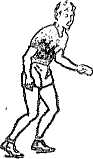 Верхняя прямая подача (рис.4). Удар по мячу наносят выше оси плечевого сустава, стоя лицом к сетке (прямо). Мяч подбрасывают почти над головой и несколько впереди на высоту до 1,5 м. Замах выполняют вверх-назад, руку поднимают и отводят согнутой в локте за голову. Угол сгибания в локтевом суставе (плечо - предплечье) не должен быть меньше 90. Одновременно с замахом прогибаются в грудном и поясничном отделах, правое плечо отводят назад. При ударном движении правую руку разгибают в локтевом суставе, поднимают и маховым движением выносят вверх, правое плечо поднимают вверх. Продолжая маховое движение, игрок выводит руку к месту встречи с мячом несколько впереди себя. Удар выполняют сзади и несколько снизу, чтобы мяч двигался вперед и вверх.