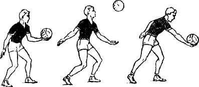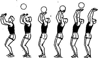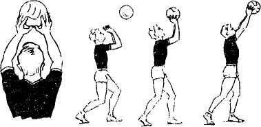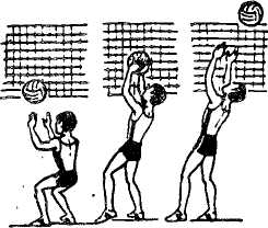 Передача мяча в прыжке. Передачу в прыжке выполняют в том случае, когда мяч летит высоко и за игрока. Разбег и прыжок осуществляют так же, как при нападающем ударе (см. далее). Во время взлета руки выносят так, чтобы кисти были над головой игрока несколько выше, чем при выполнении обычного варианта передачи. Встречное ударное движение выполняется в высшей точке прыжка за счет активной работы рук и минимальными движениями туловища и ног; такие передачи могут быть лишь короткими и укороченными.