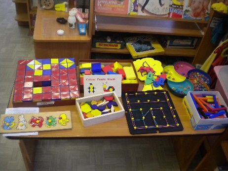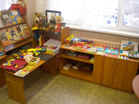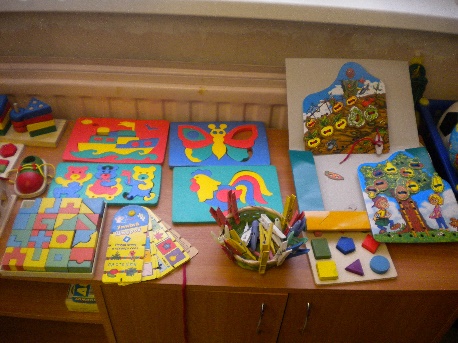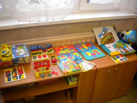 Тематические зоны: формирование элементарных математических способностей- игры на развитие логического мышления « Математический планшет», « Логические дроби», «блоки Дьенеша», « Палочки Кьюзенера», развивающие игры Воскобовича, игры Никитина, головоломки. практическая деятельность (сюжетная игра); сенсорное развитие- (занимательные материалы по сенсорному развитию: игры « пощупай и угадай», различные шнуровки, набор собери бусы, пазлы; зона для игр с водой и песком и ознакомление со свойствами предметов- опыты с водой (вода не имеет вкуса и цвета, фильтрация воды); языковое развитие (игры для автоматизации и дифференциации звуков.