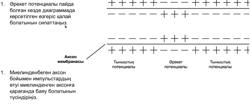 Дескриптор: - әрекет потенциалы пайда болған кездегі өзгерісті сипаттайды – 2 балл; - миелинденбеген аксон импульсының баяу болатынын түсіндіреді – 2 балл; Дескриптор: - жүйке импульсындағы әрекет потенциалын ашық сұрақтарға жауап бере отырып сипаттайды – 2 балл; |