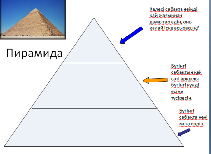 Рефлексия Пирамида» арқылы сабақтан алған әсері мен ұсынысын жазады.