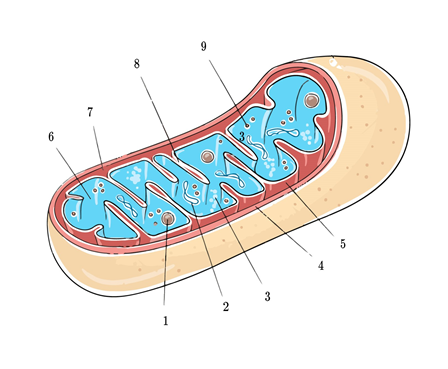 1- түйіршіктер, 2 - ДНК, 3 - АТФ-синтаз молекулалары, 4 - сыртқы мембрана, 5 - ішкі мембрана, 6 - матрикс, 7- мембрана аралық кеңістік, 8 - кристалар, 9 - рибосомалар.