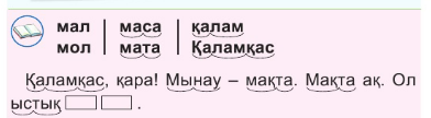 2-тапсырма 1.Өтілетін жаңа дыбысы бар «мақта» сөзін бөліп алып, дыбыстық талдау жасау. 2.Сөзді «мақ-та» деп созып айтып, жаңа дыбыстың орнын анықтау. 3.«М» дыбысының айтылу ерекшелігімен танысу. 4.«М» дыбысының таңбасы – оның әрпімен танысу. 5.Қарандаштардан «М» әрпін жасау. 3-тапсырма. Оқылым Шарты: Сөздерді және сөйлемдерді буындап оқы.
