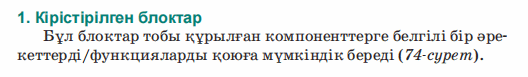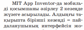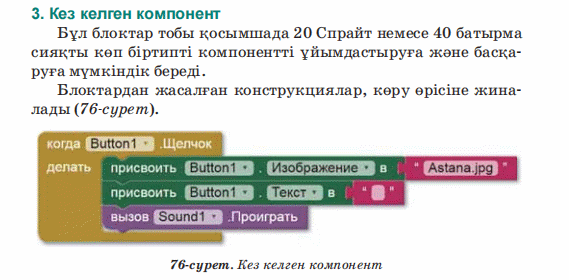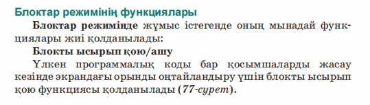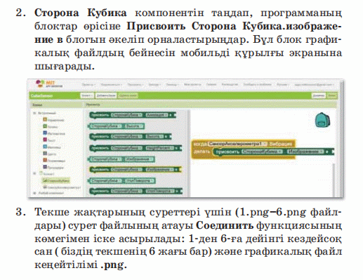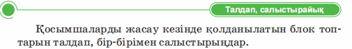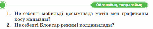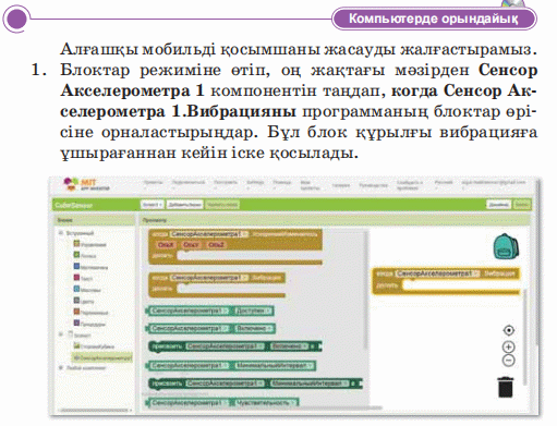 Дескриптор: Не себепті мобильді қосымшада мәтінмен графиканы қосу маңыздылығын айтады Не себепті блоктар режимі қолданылатынын біледі 2 балл Дескриптор: Қосымшаларды жасау кезінде қолданылатын блок топтарын талдап, бір-бірімен салыстырады 2 балл Дескриптор: Берілген тасырма бойынша сөйлемді аяқтайды Дескриптор: -Компьютер тапсырмаларды орындайды 2 балл Дескриптор: Онлайн платформа арқылы сұраққа жауап береді 2 балл |
