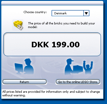 Check price (Узнать цену) - (Ctrl-B/Cmd-B) Получить оценочную стоимость своей модели. Из окна Проверки цены можно перейти в LEGO Store на LEGO.com. |