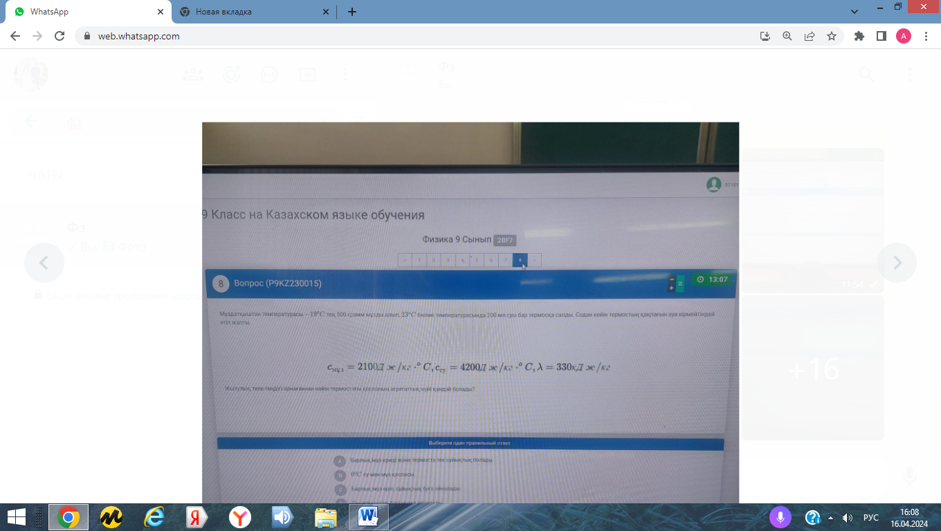 7. Мұздатқыштан температурасы -190С массасы 500кгмұзды алып 23 0С бөлме температурасында 200мл суы бар термосқа салды. Содан кейін термостың қақпағын ауа кірмейтіндей етіп жапты. Жылулық тепе теңдік орнағаннан кейін қоспаның агрегаттық күйі қандай болды?