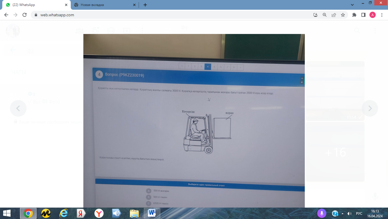 3. Қорапты жүк көтергіш көтереді. Қораптың жалпы салмағы 3000Н. Қорапты көтергіштің тарапынан жоғары бағытталған 3500Н күш әсер етеді. Қорытынды күшті есептеңіз және күштің бағытын табыңыз.