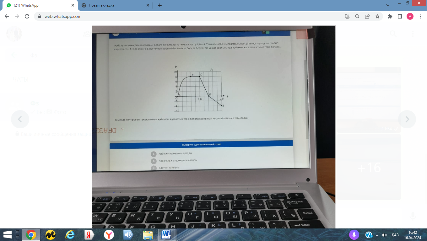 13. Арба түзу сызықпен қозғалады. Арбаға айнымалы нәтижелі күш түсіріледі.Төменде арба жылдамдығының уақытқа тәуелділік графигі көрсетілген. А,В,С, D және Е нүктелері графикті бес бөлікке бөледі. Белгілі бір уақыт аралығында арбамен жасалған жұмыс теріс болады.