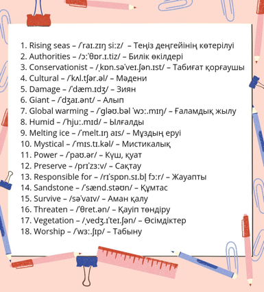2.Brainstorming activity(3 min) Now you should find the topic of the lesson using the pictures. 3.Now,listen to me,then repeat after me. (5min) New Words: 1)Rising seas 2)Authorities 3)Conservationist 4)Cultural site 5)Damage 6)Giant 7)Global warming 8)Humid 9)Melting ice 10)Mystical 11)Power 12)Preserve 13)Responsible for 14)Sandstone 15)Survive 16)Threaten 17)Vegetation 18)Worship 4. Watch the video.(2min) You should watch the video material, and answer the questions. 5. Read the text and answer the questions.(5min) 1)How old is Stonehenge? 2)Why did they build Stonehenge? 3)What problems does Stonehenge face? 4)Are the temples of Angkor Wat a popular holiday destination?How do you know? 5)Who is working to preserve the temples? 6. Match the problems to the solutions and make sentences.(3min) Ex4 p43 SB