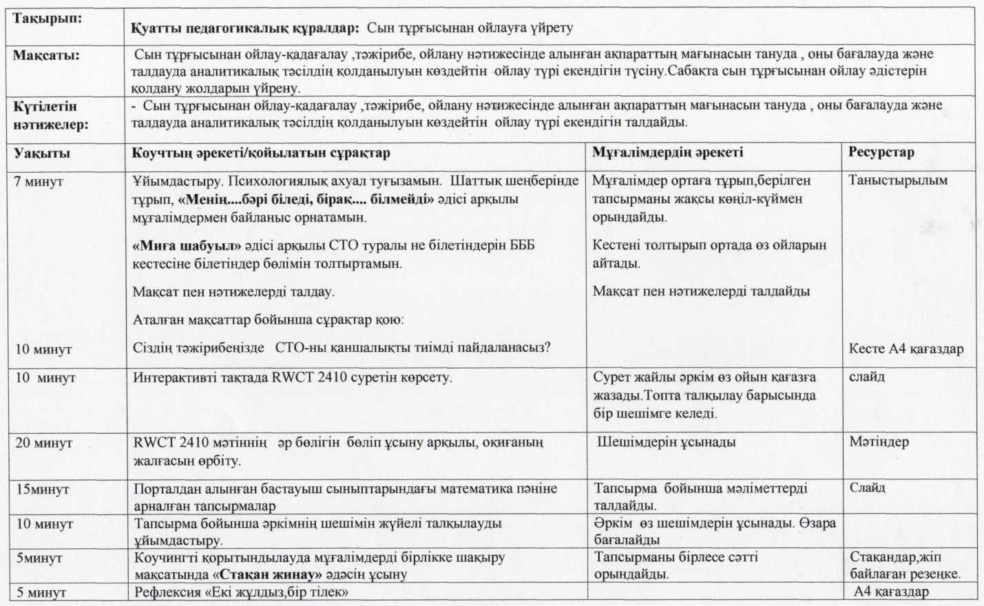 Мақсаты - барлық жастағы оқушыларға кез келген мазмұнға сыни тұрғыдан қарап, өзіндік пікір айтуға, саналы шешім қабылдауға үйрету болып табылады. Оқушыны сыни ойлауға жетелеу үшін мұғалімнің өзі сыни ойлауды меңгеруі тиіс. Коучингті әріптестерімнің ортасында жағымды психологиялық ахуал туғызудан бастадым. Ол үшін мұғалімдерді ортаға шеңберге тұрғызып, «Менің....бәрі біледі, бірақ.... білмейді» әдісі арқылы мұғалімдермен байланыс орнатамын. Яғни, мұғалімдердің барлығымыз білетін жақтарын айтып, сонымен қатар біз білмейтін өздері ғана білетін тұстарын білу. Бұндай әдісті таңдаудағы мақсатым, әріптестерімді одан әрі жақсы тану. Таңдалған әдіс сәтті шықты, себебі, мұғалімдер белсенді, әрі көтеріңкі көңіл-күймен жауап берді. Ары қарай «Миға шабуыл» әдісі арқылы СТО туралы не білетіндерін білу мақсатында БББ кестесіне білетіндер бөлімін толтырттым және ортаға салып оқыттым. Кестенің өздерінде қалатынын, коучинг соңында қалған бөліктерін толтыратындарын айттым. Коучинг мақсаты мен күтілетін нәтижелер тақыланып болғаннан кейін, негізгі тапсырмаға көштім. «Адасқан бала» суретін интерақтивті тақтада көрсеттім. Мұғалімдер өз пікірлерін қағаз бетіне түсірулерін сұрадым, келесі тапсырма барлық пікірлерді ортаға салып,талқылап дұрыс жауапқа ең жақын деген пікірді таңдап алу. Дұрыс жауапқа жақын жауап берген мұғалімдер болды. Екінші, үшінші тапсырмаларды орындаған кезде мұғалімдер жылдамдық пен нақтылық таныта бастады. Басында «сыни ойлау» деген сөздің өзі мұғалімдердің біраз қобалжуына, тартына жауап беруіне әсер етті. Негізі сыни ойлау арқылы оқушы өзіне «Нені оқимын?», «Не үшін оқимын?», «Неге оқимын ?»- деген сауалдарды қойса, сонда ғана біз жан –жақты дамыған көшбасшы оқушы қалыптастырар едік. Қазіргі таңда сандық технологиялар дамыған кезде сыни ойлай білетін тұлғаны дамыту басты мәселелердің бірі болып отыр. Менің әріптестерімнің де алдында тұрған басты мәселелерінің бірі- осы сыни ойлауға үйрету, өз ойын еркін жеткізе білуге жетелеу болып табылады. Ол үшін мұғалім ұстанымы да өзгеруі тиіс. Менің де алдыға қойған мақсатым осы еді. Коучинг кезінде мұғалімдердің қызығушылығы артты. Сыни ойлау бағдарламасы бойынша ойлары өзгере бастады.Талқылау сәтінде мұғалімдер еркін пікірлесе білді. Тапсырмаларды орындаған сәтте жеңіл орындады. Тек менің берген кейбір тапсырмаларым мұғалімдерге таныс болды. Сондықтан қызығушылықтары сәл төмендеді. Кері байланыс сәтінде мұғалімдер екі жұлдыз бояп,бір тілектерін айтты.