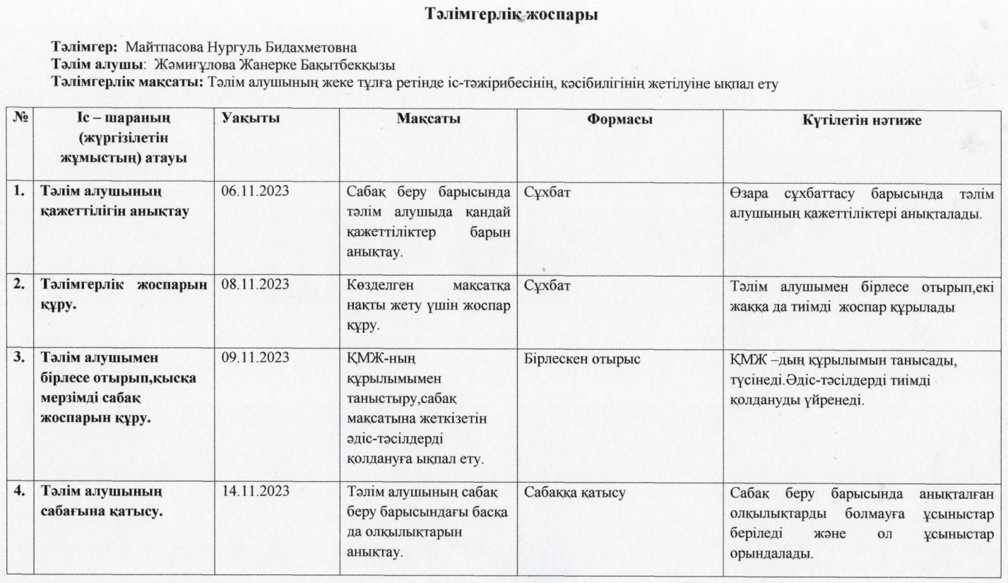 Уақыт – өзгерістер мен жаңалықтардан тұрады. Менің де өзгерістерім деңгейленген курсты бастап оқығаннан бері басталды. Жалпы өмірге, педагогикаға, мамандығыма деген көзқарасым өзгере бастады. Гимназия әкімшілігіне барып оқып жатқан курсым жайлы, тәжірибеде қандай жұмыстар атқаруым керек екенін түсіндіріп өттім. Гимназия әкімшілігі жас маман Жәмиғұлова Жанерке Бақытбекқызын тәліп ретінде ұсынды. Жәмиғұлова Жанерке Бақытбекқызы- Қазақстан- Американдық еркін университетін биыл аяқтап бастауыш сынып мұғалімі ретінде жұмысқа қабылданған. Педагог – жас маман. Алғаш келгеннен бастап әдіс –тәсілдерді тиімді пайдалану жолдарын, құжатпен жұмыс немесе оқушымен қарым- қатынас,ата –анамен жасалатын жұмыстар туралы сұрап, пікірлесіп жүретін. Жас маманға көмек беру мен үшін де қызықты, тәжірибе жинаудың бір түрі еді. Ендігі кезекте гимназиямыздың тәжірибелі мұғалімдерінен ақыл –кеңестер алдым. Жұмысымды жоспарлауды ойладым. Гимназияның бастауыш сынып мұғалімдерімен тәліпке қандай көмек ұсынатыным жайлы ақылдастым. Жанеркені әкімшіліктің шешімімен таныстырып,тәліп пен тәлімгердің жұмысы жайлы түсіндірдім.Тәлім алушы екеуіміз бірлесе отырып,екі жаққа да тиімді болатындай етіп тәлімгерлік жоспарын құрдық.Бағдарламаның идеясымен таныстырып, сабақты бірлесе жоспарлау, сабақты талқылау жоспарға енгізілді. Тәлім алушымен сұхбаттасу барысында анықталған қажеттілік, алғашқы өтініші қысқа мерзімді жоспар құрудың жолдарын түсіндіруді, бірге құруды сұрады.