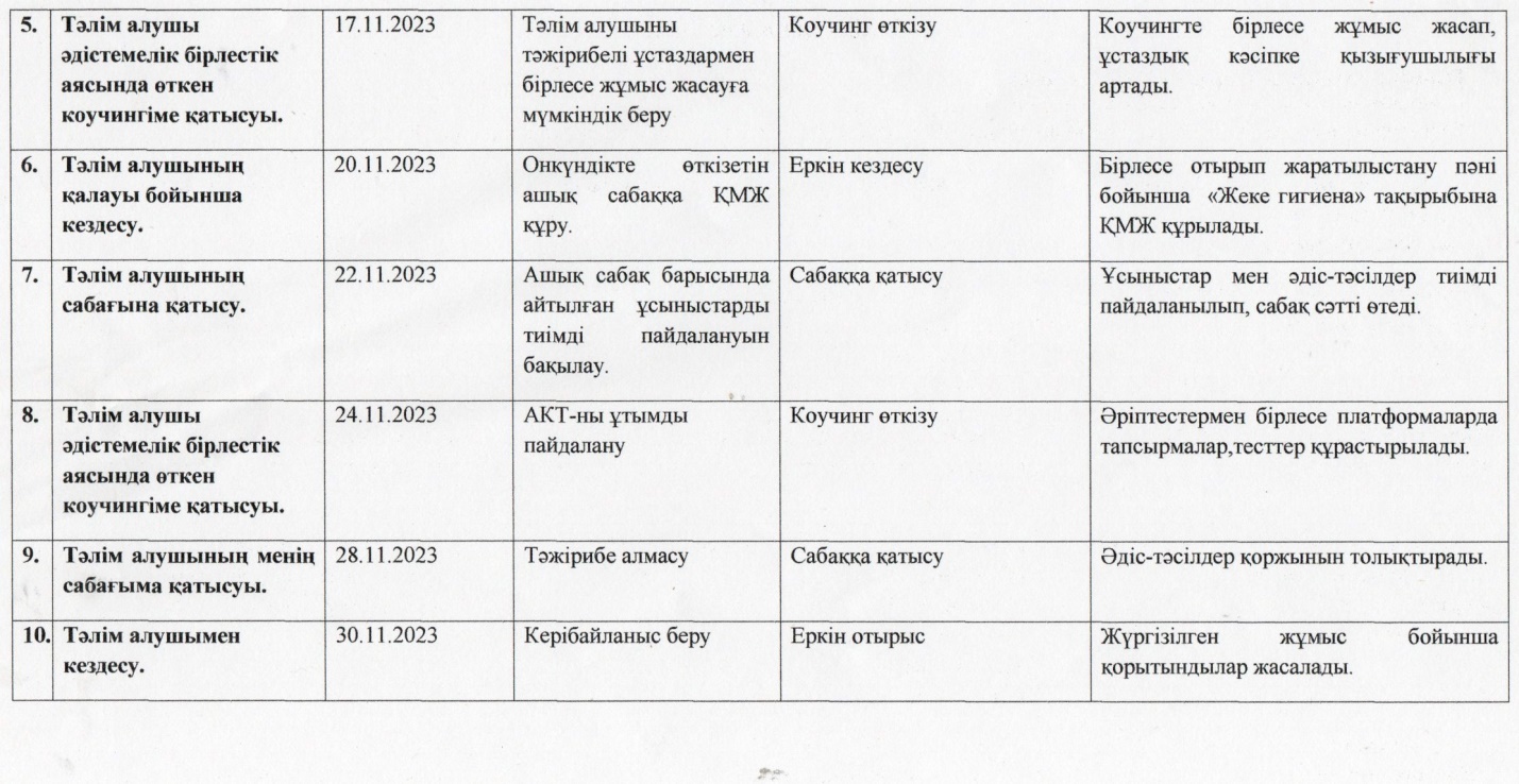 Тәліппен кездесіп жоспар құрдым. Жоспар бойынша бірнеше сабағына қатыстым. Бірлесіп қысқа мерзімді сабақ жоспарладық. Сабақ жоспарлаған кезде тәлібімнің әдіс – тәсілдерді таңдауда қиналатынын байқадым.Сол үшін тәлібіме бірнеше әдістер жинағын ұсындым. Сабақта қобалжымау үшін сабақты жоспарлап, мұқият дайындалуы керек екенін түсіндірдім. Көшбасшылыққа жетелейтін ойындар, жаттығулар, жағдаяттар туындатып шешуін тәжірибелі мұғалімдермен бірлесе табуына мүмкіндік жасадым.
