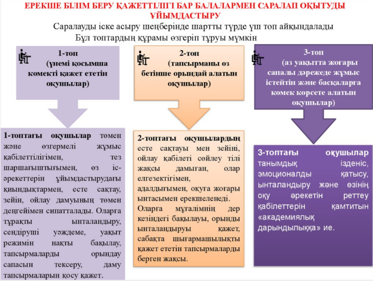 а) қалыпты сыныпта оқу - танымдық қабілеті сақталған оқушылар үшін. Олар үшін арнайы білім беру бағдарламалары қажет емес, тек мұғалімнің жеке көмегі қажет болуы мүмкін. Бұл сыныпта ерекше қажеттіліктері бар 1-2 оқушыны оқытуға болады. Мұндай сыныпта білім беру саласындағы педагогикалық мамандар оқушыларды ауытқусыз оқыта алады. Қажет болған жағдайда мұғалім психологиялық-педагогикалық сүйемелдеу қызметінің, ресурстық орталықтардың мамандарынан қосымша кәсіби ақпарат ала алады.