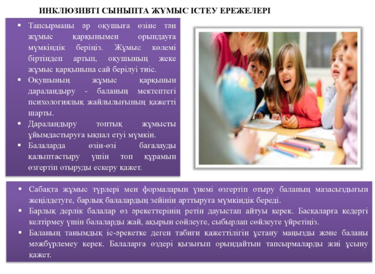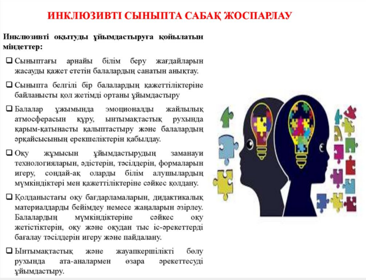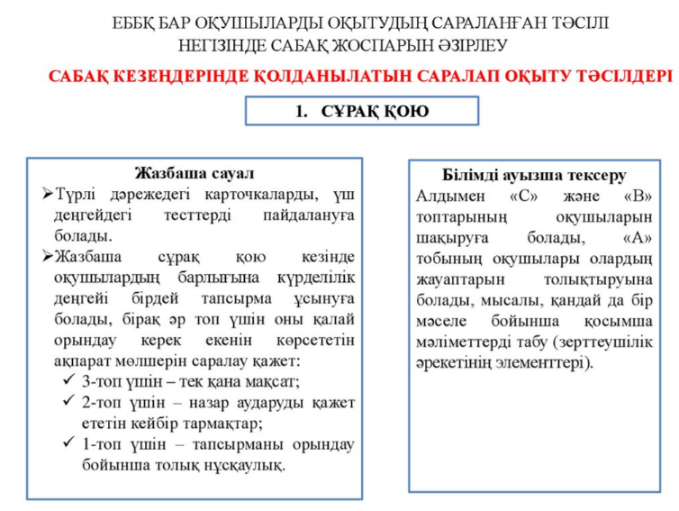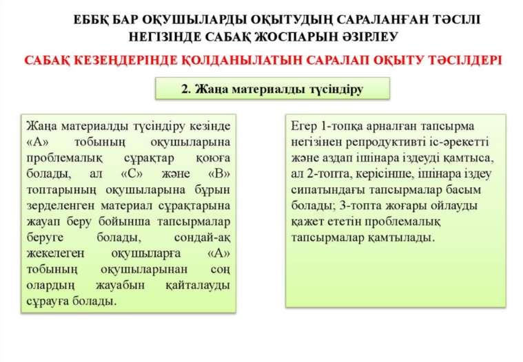 - оқушылардың әртүрлі қажеттіліктеріне сәйкес келетін оқыту әдістерін қолдану;