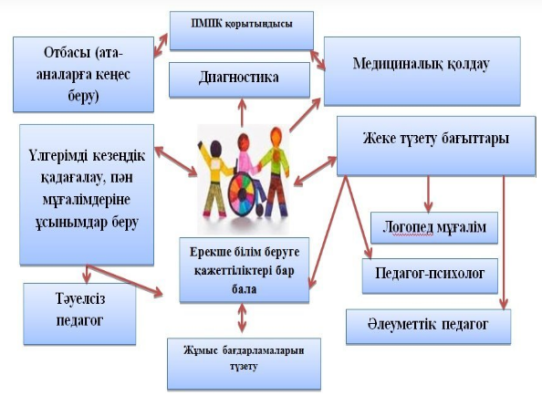 5) психикалық даму мониторингі және білім беруде ерекше қажеттілігі бар балаларды медициналық-әлеуметтік-психологиялық-педагогикалық тұрақты қолдау»[2,19-б.].