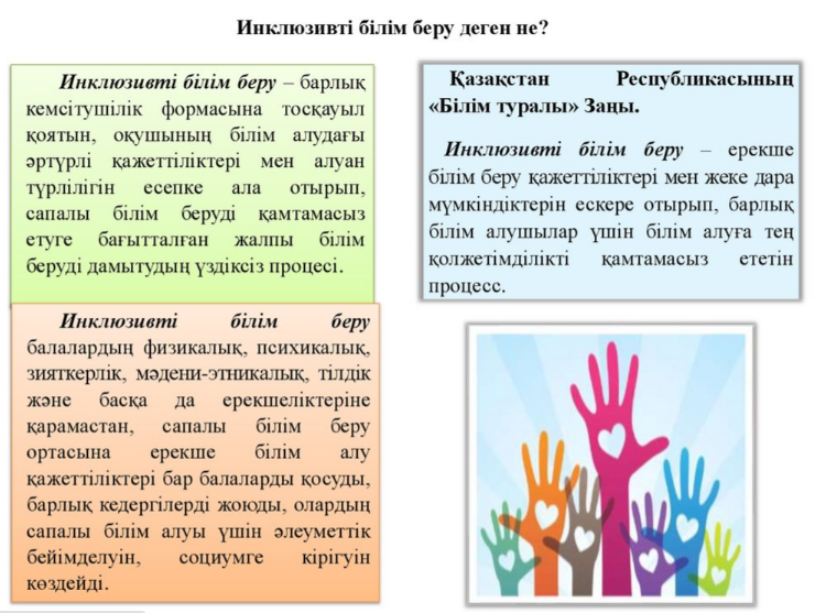 - балалардың қандай да бір дискриминациясын жоққа шығару, барлық адамдарға деген теңдік қатынасты қамтамасыз ету, сонымен бірге, оқытудың ерекше қажеттілігі бар балаларға арнайы жағдай қалыптастыру туралы мәліметтер келтіру;